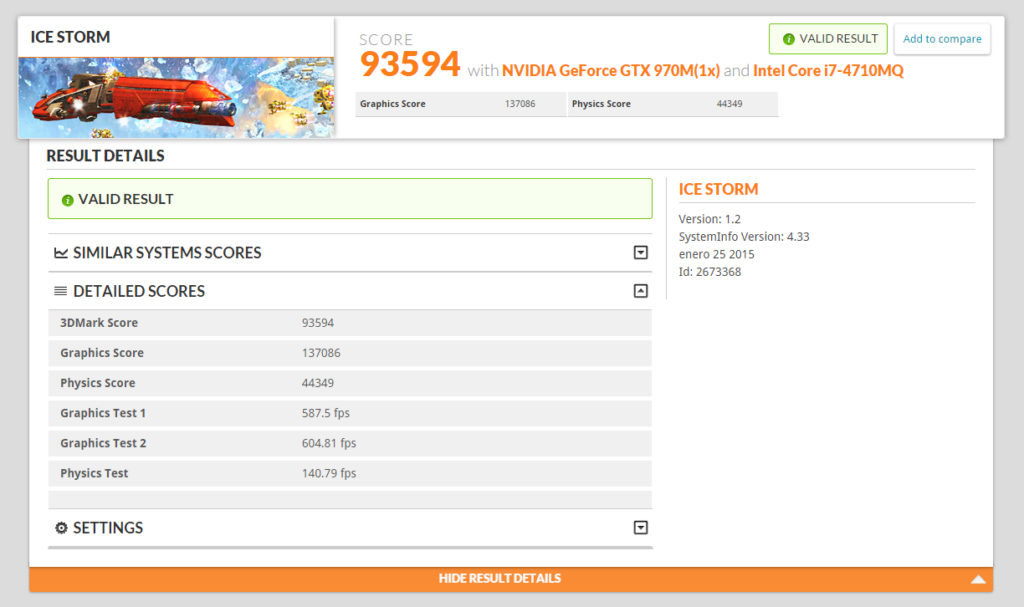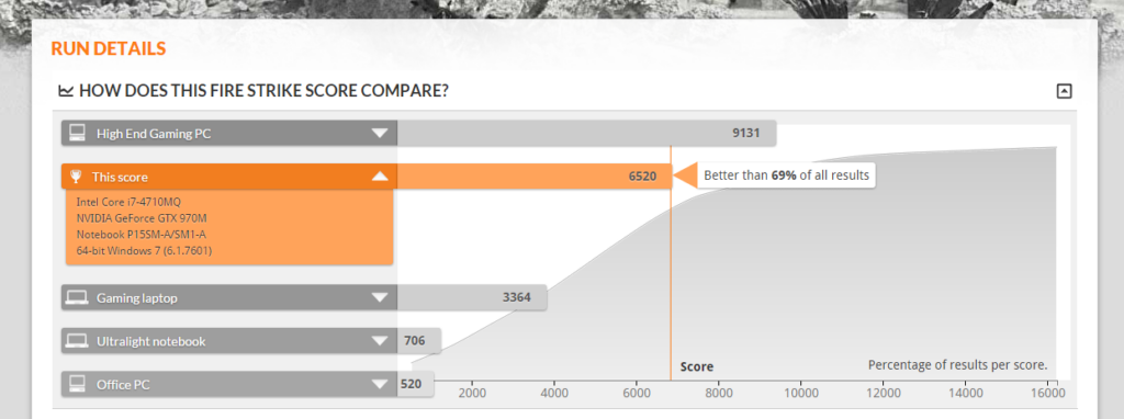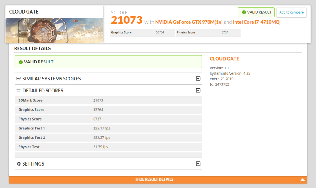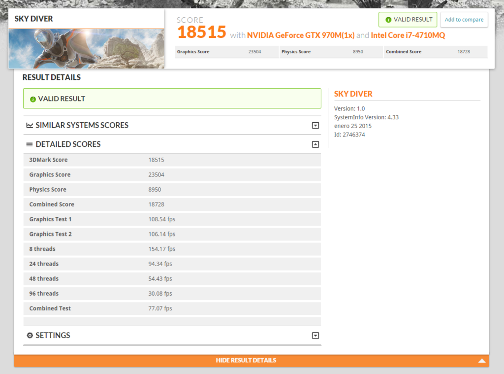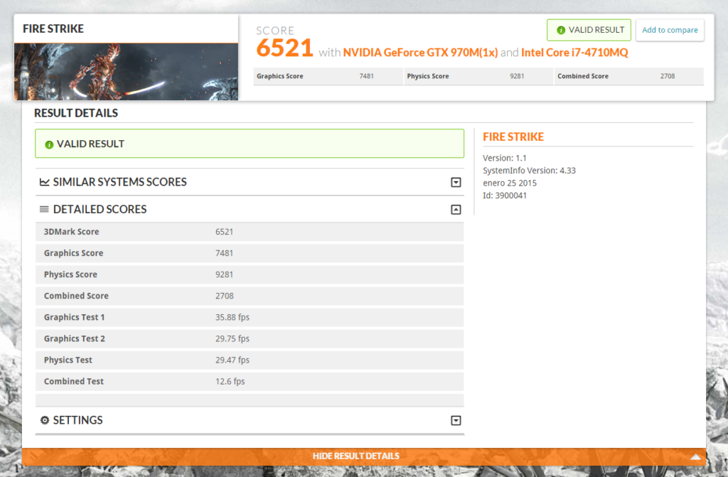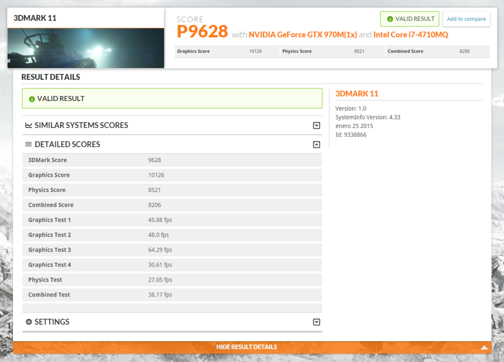 Dado que no dispongo de las versiones de pago de ninguna de las versiones de 3D Mark no puedo ver resultados muy detallados, solamente los básicos. En 3D Mark 11 la puntuación fue de 9628, mientras que en 3D Mark 10 se realizaron varios Benchmarks diferentes de diferente año y diferente calidad gráfica, por lo que las puntuaciones aumentan en las pruebas más antiguas. Pero se puede apreciar que en la prueba más reciente de 3D Mark 10, llamada Firestrike, la puntuación es a mi parecer muy decente, estando por encima de un portátil para jugar (gaming laptop) y sólo por debajo de un equipo de alta gama para videojuegos (High End Gaming PC). Estos datos son aproximados, y efectivamente hay portátiles mejores que el Graphite 15.